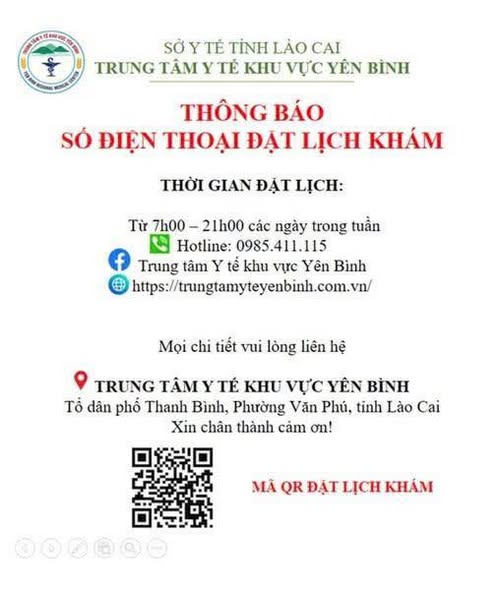 Với mục đích hỗ trợ tốt hơn nữa cho người bệnh và người nhà người bệnh khi đến khám và điều trị tại Trung tâm Y tế Khu Vực Yên Bình Trung tâm Y tế triển khai hỗ trợ nhận đặt lịch khám qua: hotline: 0985.411.115 fanpage: https://www.facebook.com/share/1BskvR5AAh/?mibextid=wwXIfr https://trungtamyteyenbinh.com.vn/ Quét mã QR trên hình. Với