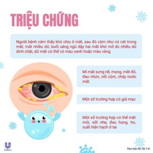 Cảm giác cộm như có cát, chảy nước mắt, mi sưng nề, đau nhức.