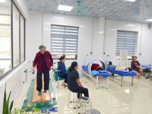 Máy kéo giãn cột sống, máy sóng ngắn, máy siêu âm điều trị, máy điện xung, điện châm, máy từ trường, đèn hồng ngoại cùng nhiều dụng cụ phục hồi chức năng như xe đạp tập, ròng rọc vận động…